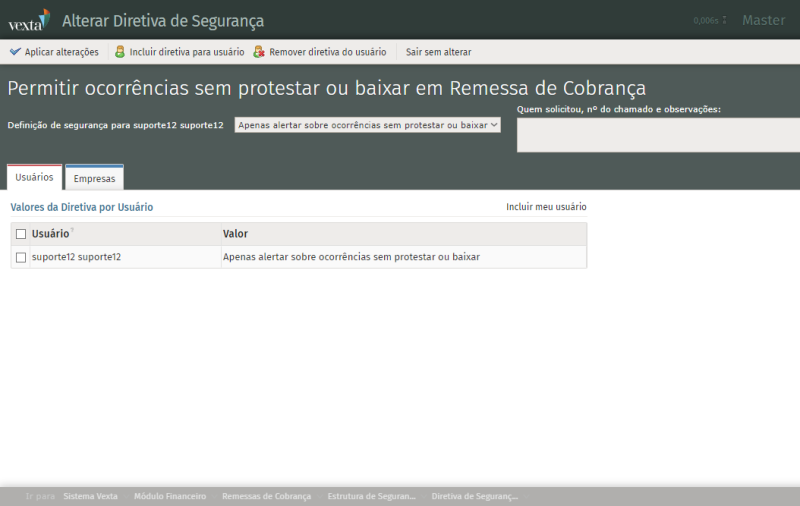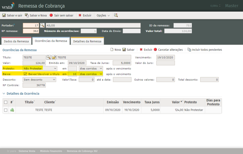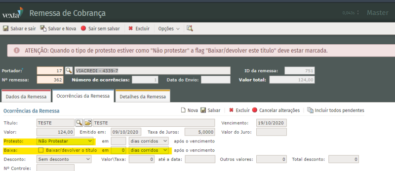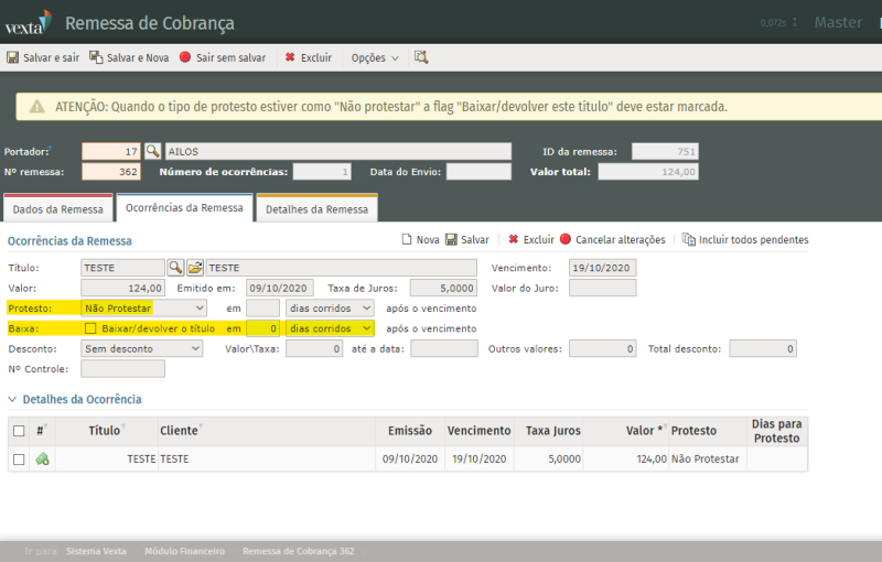 Caso seja feito de outra forma, o sistema acusa o erro:ATENÇÃO: Quando o tipo de protesto estiver como "Não protestar" a flag "Baixar/devolver este título" deve estar marcada.