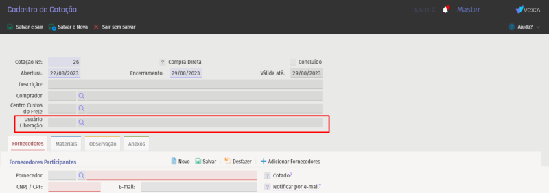 Agora, o sistema permite que o usuário determine quem fará a liberação da cotação. Para isso, é necessário preencher o campo "Usuário Liberação".