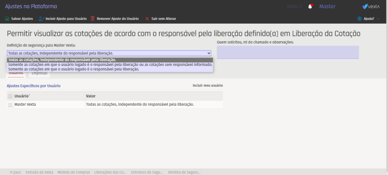 A validação do "Usuário Liberação" é feita quando um usuário gera o pedido de compras na tela de "Liberação de Cotação". Caso selecionado um usuário na criação da cotação, apenas ele poderá gerar o pedido de compra.