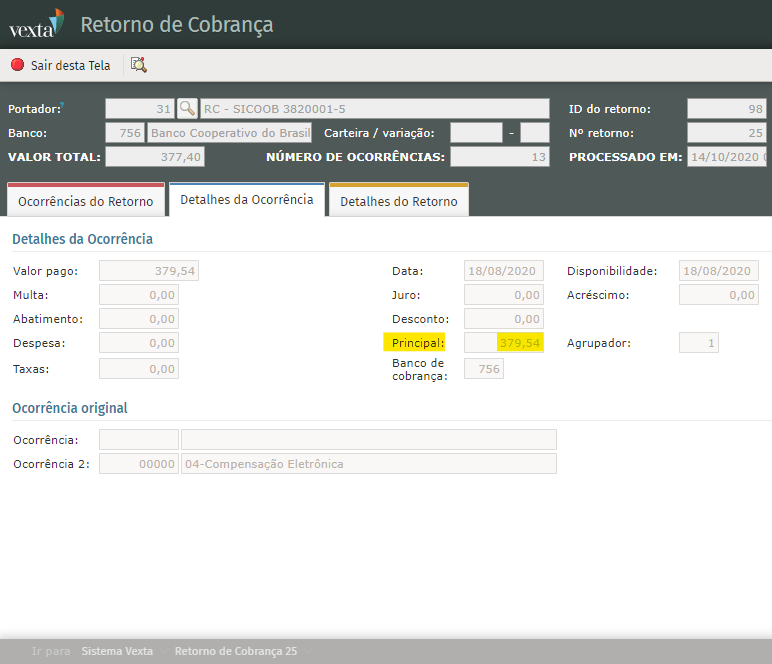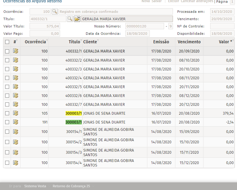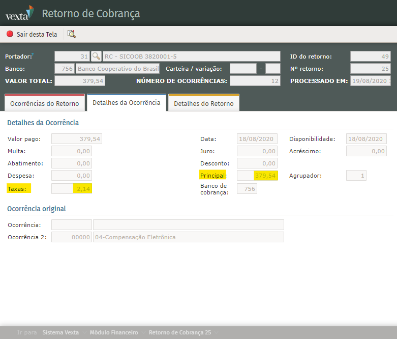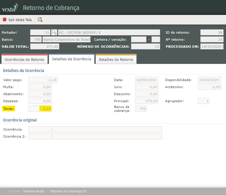 Ajustada a rotina de importação de retornos do banco Sicoob no padrão CNAB 240 para gerar duas ocorrências de retorno separadas, quando vierem valores de taxa e de liquidação no mesmo registro.