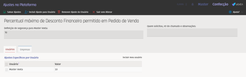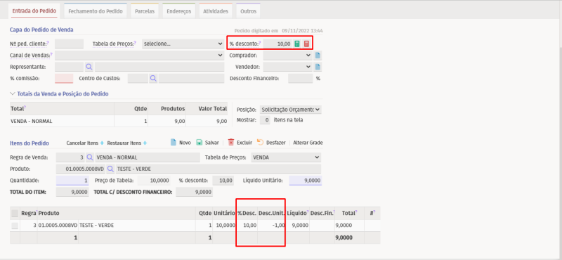 Foram incluídas as mesmas validações feitas para o desconto financeiro: se o % de desconto incluído no item ou na calculadora for negativo, o sistema irá transformar o valor em positivo. Se o %desconto for maior que 100% o sistema emitirá mensagem e não permitirá salvar. Se a diretiva estiver configurada com qualquer valor, se incluído %desconto superior no pedido, o sistema irá emitir mensagem e não permitirá salvar.