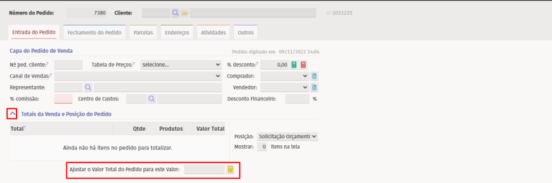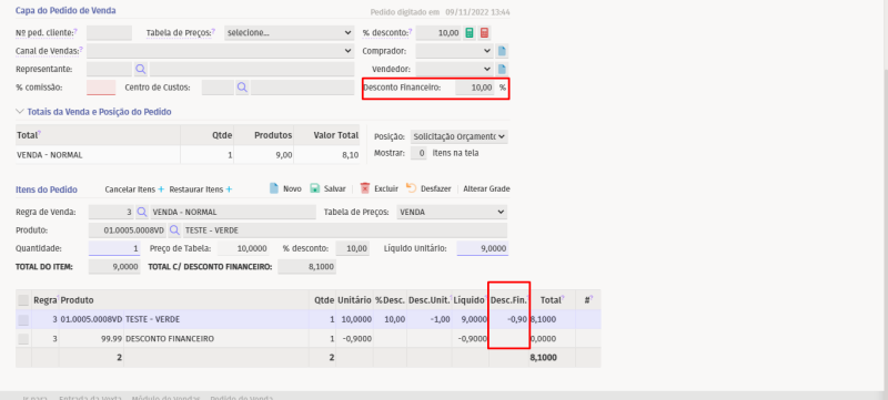 Para o desconto2 (sobre o valor líquido dos itens), será utilizado o percentual do "Desconto Financeiro" ou o "Ajuste do valor total da venda". Ao incluir o item de desconto, o sistema irá verificar quais itens formam a base do desconto (desconsiderando os itens em promoção) e irá ratear o desconto entre estes itens, e incluir a informação do desconto de cada item, no grid. Inclua o desconto pelo preenchimento do Desconto Financeiro e confira. Preencha o desconto pelo Ajuste do Valor total do pedido e confira. Zere o percentual do Desconto Financeiro e verifique se foi excluído o item de desconto e os rateios na coluna "Desc.Fin", atualizando os valores dos itens no grid e o total no rodapé.
