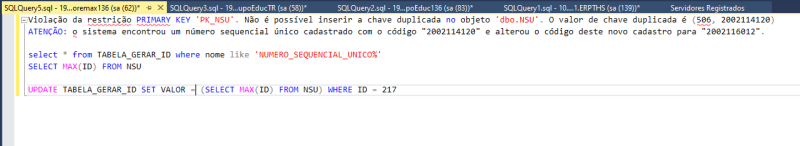 /*Violação da restrição PRIMARY KEY 'PK_NSU'. Não é possível inserir a chave duplicada no objeto 'dbo.NSU'. O valor de chave duplicada é (506, 2002114120)