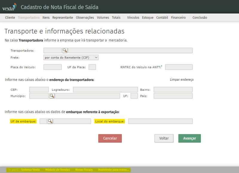 - Correção na rotina de alteração de nota fiscal de saída, para quando cadastra uma nota com cliente do exterior, na aba "Transportadora", apareça os campo "UF de embarque" e "Local do embarque", tanto na criação quanto na alteração destas notas.