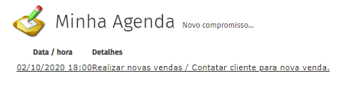 Localizada na parte inferior do ERP Vexta, você poderá consultar toda sua agenda, onde estarão dispostas as atividades/contatos a serem realizadas por data e hora programadas.