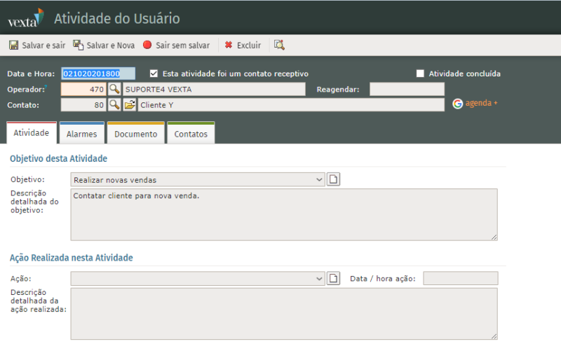 No cadastro da atividade mencionada anteriormente, você poderá definir com quem entrou em contato, se este foi receptivo (ótimo para identificar possíveis leads) e posteriormente, marcá-la como concluída assim que realmente for executada.