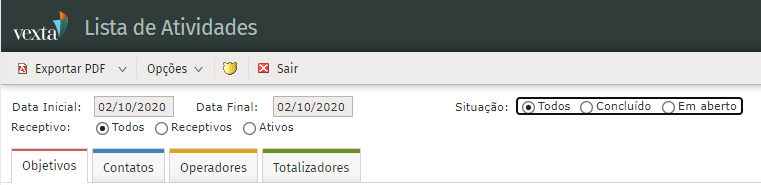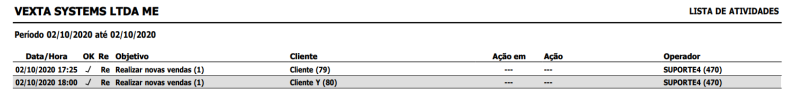 O ERP possibilita que seja exportado um relatório onde serão listadas as atividades anteriormente cadastradas, podendo o mesmo filtrar pelo o que foi "Concluído", o que ainda consta "Em Aberto", verificar por operador e acompanhar o que a equipe está conseguindo executar das atividades proposta, conforme exemplo a seguir: