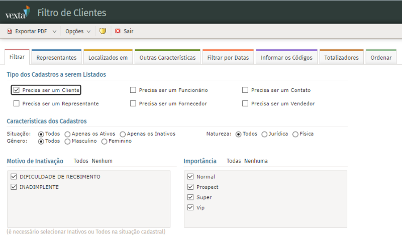 Há a possibilidade ainda de exportar um relatório muito versátil, que se chama "Lista de Clientes", onde pelo próprio ERP poderás extrair diversas informações dos seus clientes, filtrando-os por municípios, estados, representantes, possíveis bandeiras atribuídas em seus cadastros e muito mais filtros que o Vexta lhe disponibiliza... Como é possível observar a seguir: