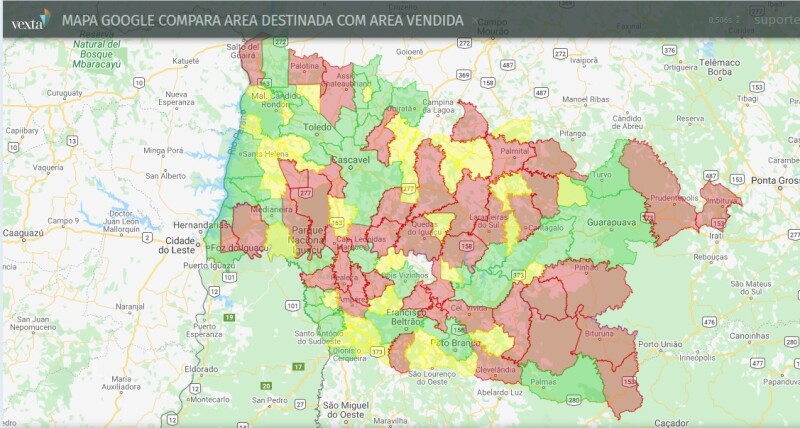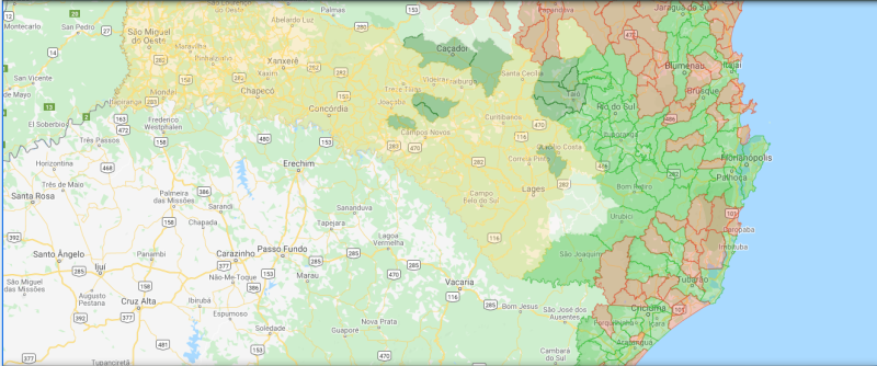 Ademais, também possuímos mapas integrados de visualização do Google, onde é possível verificar quais cidades estão ou não sendo atendidas dentro da área de um determinado representante, inclusive distinguindo por meio de cores conforme a população dos municípios. Por exemplo, temos os municípios atendidos com a cor verde, e os não atendidos em vermelho e amarelo, sendo que o critério de visualização destes dois últimos, é população acima de 7000 habitantes ou superior a 7000 habitantes, vermelho no primeiro caso e amarelo no segundo, conforme segue imagem demonstrativa: